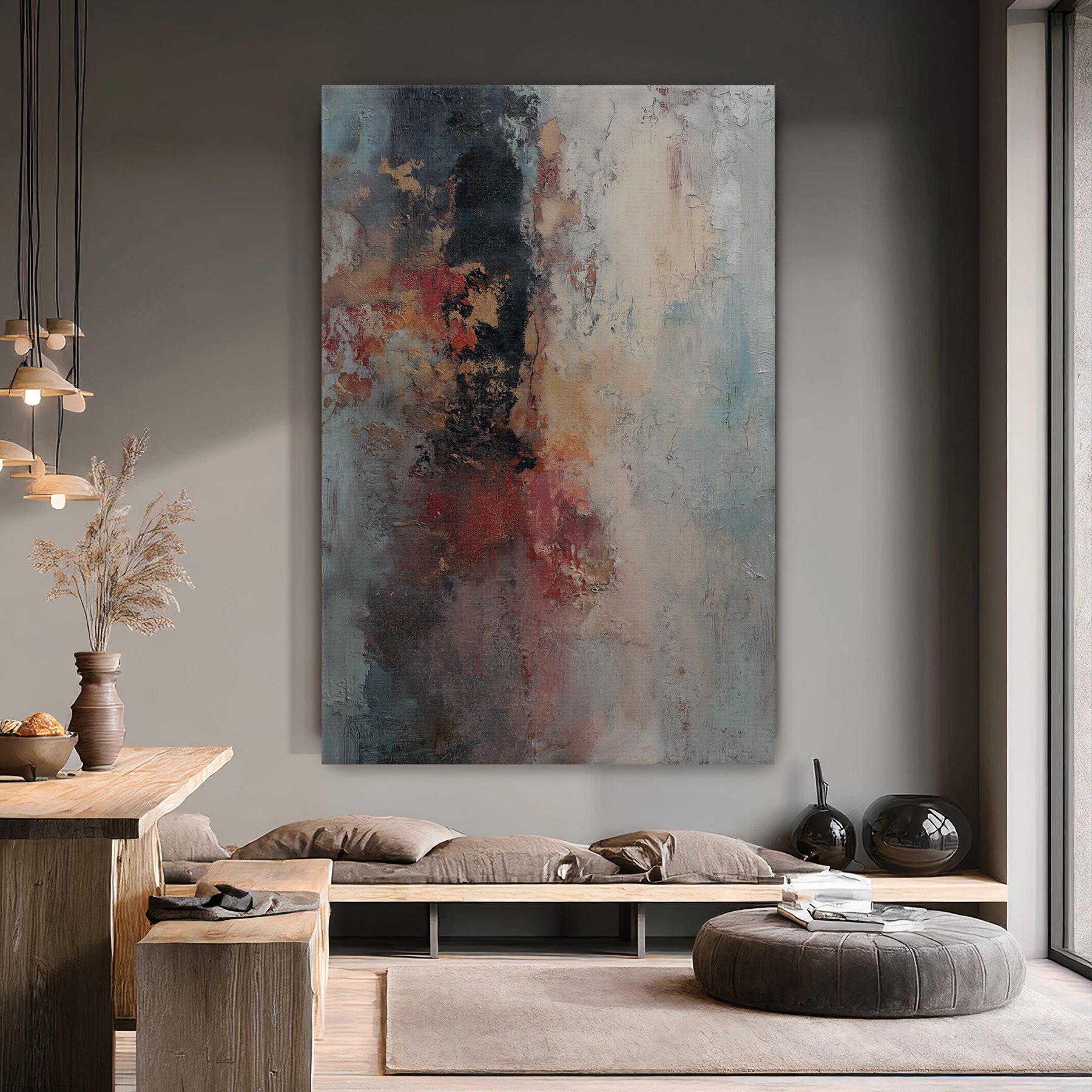 This ready-to-hang giclee print is professionally framed, beautifully showcasing the artwork's rustic, industrial palette. The cool gray contrasts powerfully with the spots of rust-red, black, and gold-flecked sienna. The frame provides a refined, finished look, making this piece ideal for creating a powerful and sophisticated atmosphere. It arrives ready to be a centerpiece on your wall.