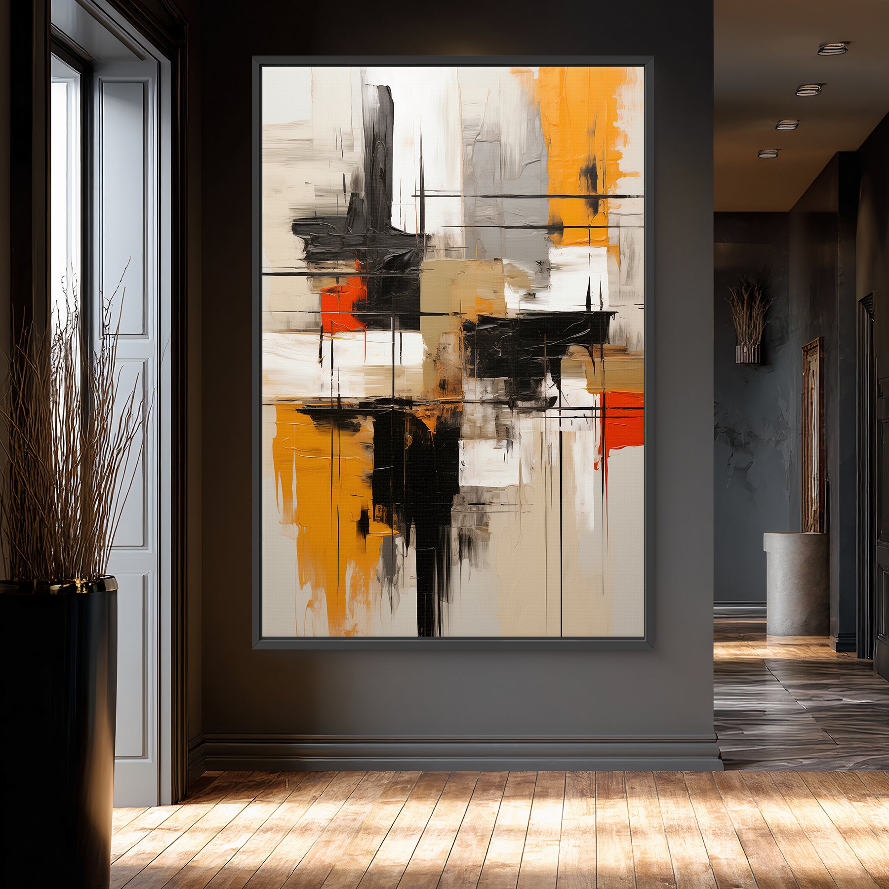 This ready-to-hang giclee print is professionally framed, beautifully emphasizing the artwork's dynamic, geometric composition and vibrant palette. The contrasting blocks of ochre, black, and red create a powerful architectural statement. The frame provides a polished, finished look, making this piece ideal for creating a powerful and sophisticated atmosphere. It arrives ready to be a centerpiece on your wall.