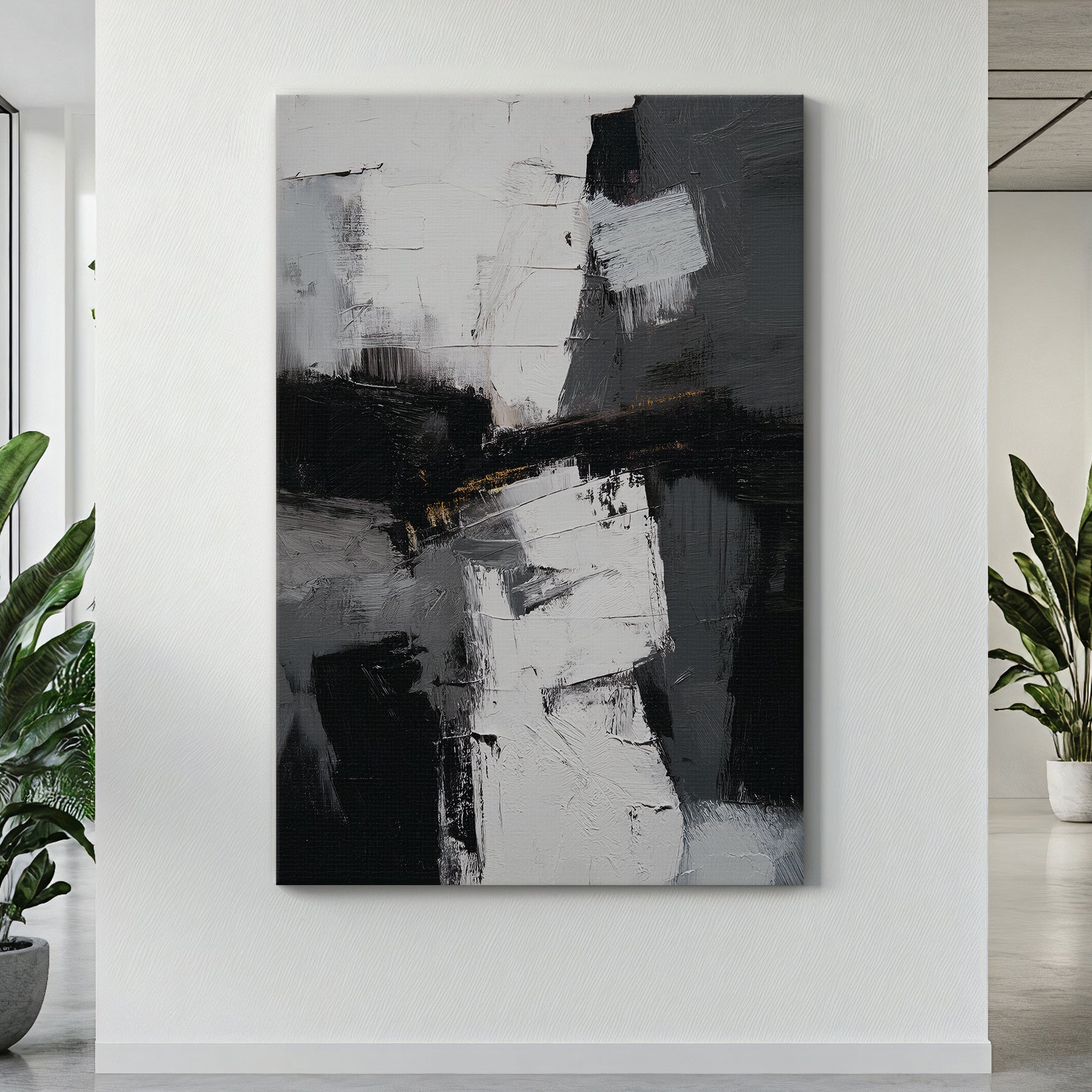 This powerful and structured high-resolution digital artwork features a strong geometric composition in a classic monochromatic palette of black, white, and charcoal gray. Bold, thick strokes create overlapping blocks and sharp lines, giving the piece a dynamic, architectural, and contemporary feel. This print is perfect for adding a sophisticated, modern, and edgy statement to industrial, office, or minimalist living spaces.