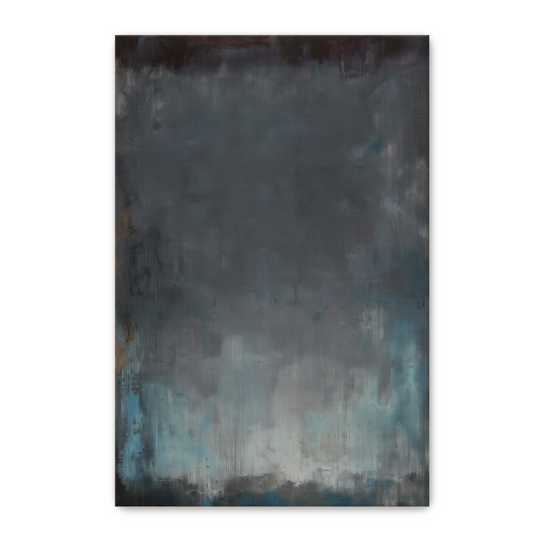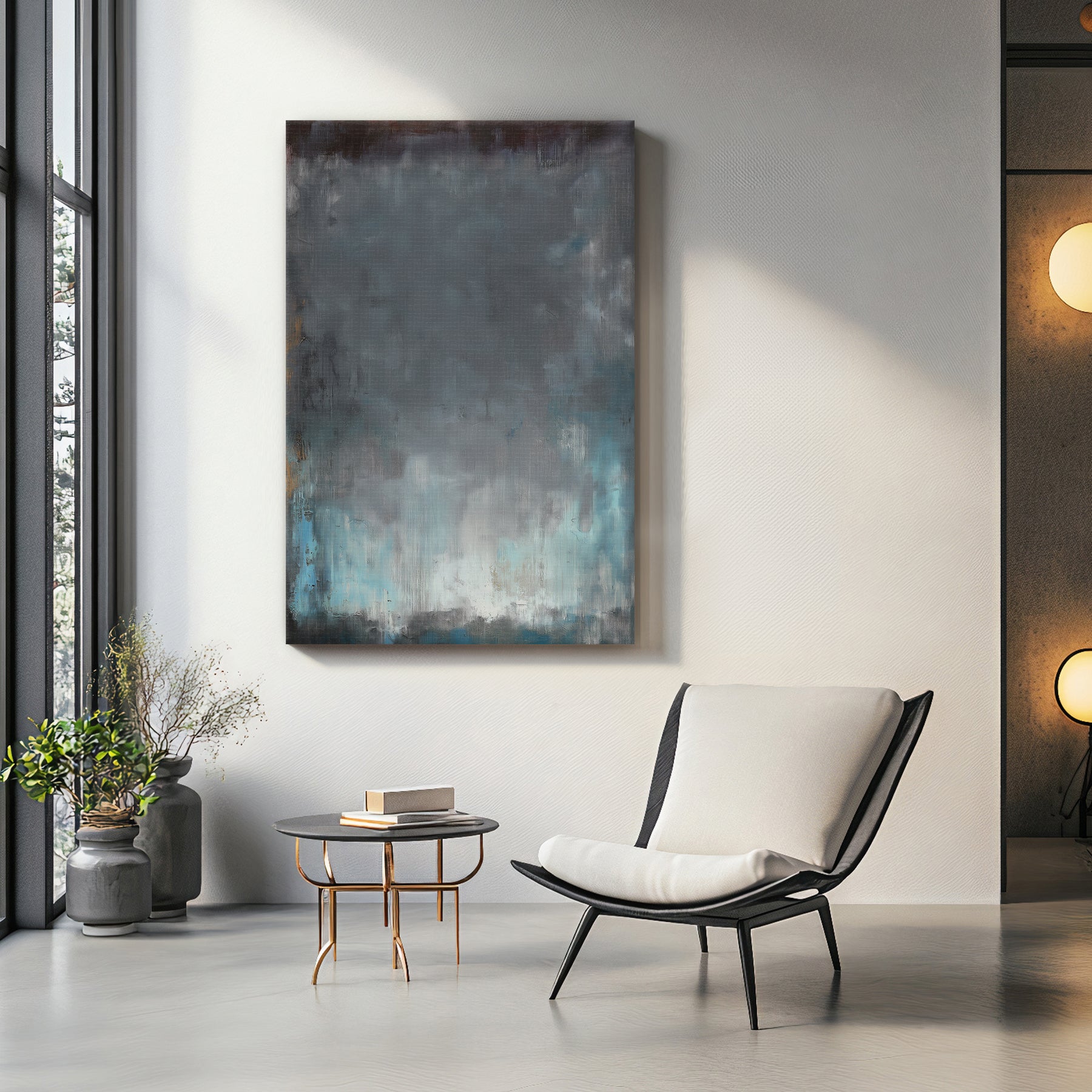 This compelling high-resolution digital artwork features a dramatic, minimalist composition with heavily layered textures and an atmospheric palette. The piece is dominated by a deep, smoky charcoal gray, which gives way to an ethereal glow of cool turquoise and icy blue at the bottom. The vertical brushwork creates a rain-like or textural effect, evoking a sense of deep mystery and calm power. This print is perfect for adding a sophisticated, moody statement to modern, industrial, or minimalist interiors.