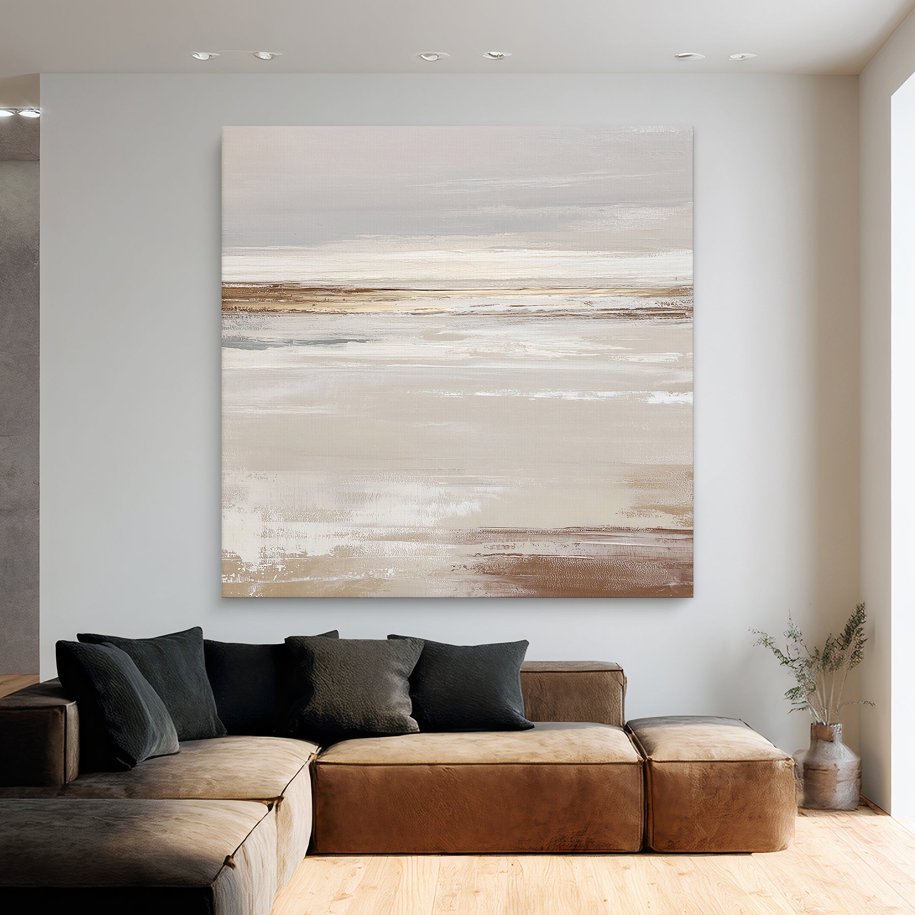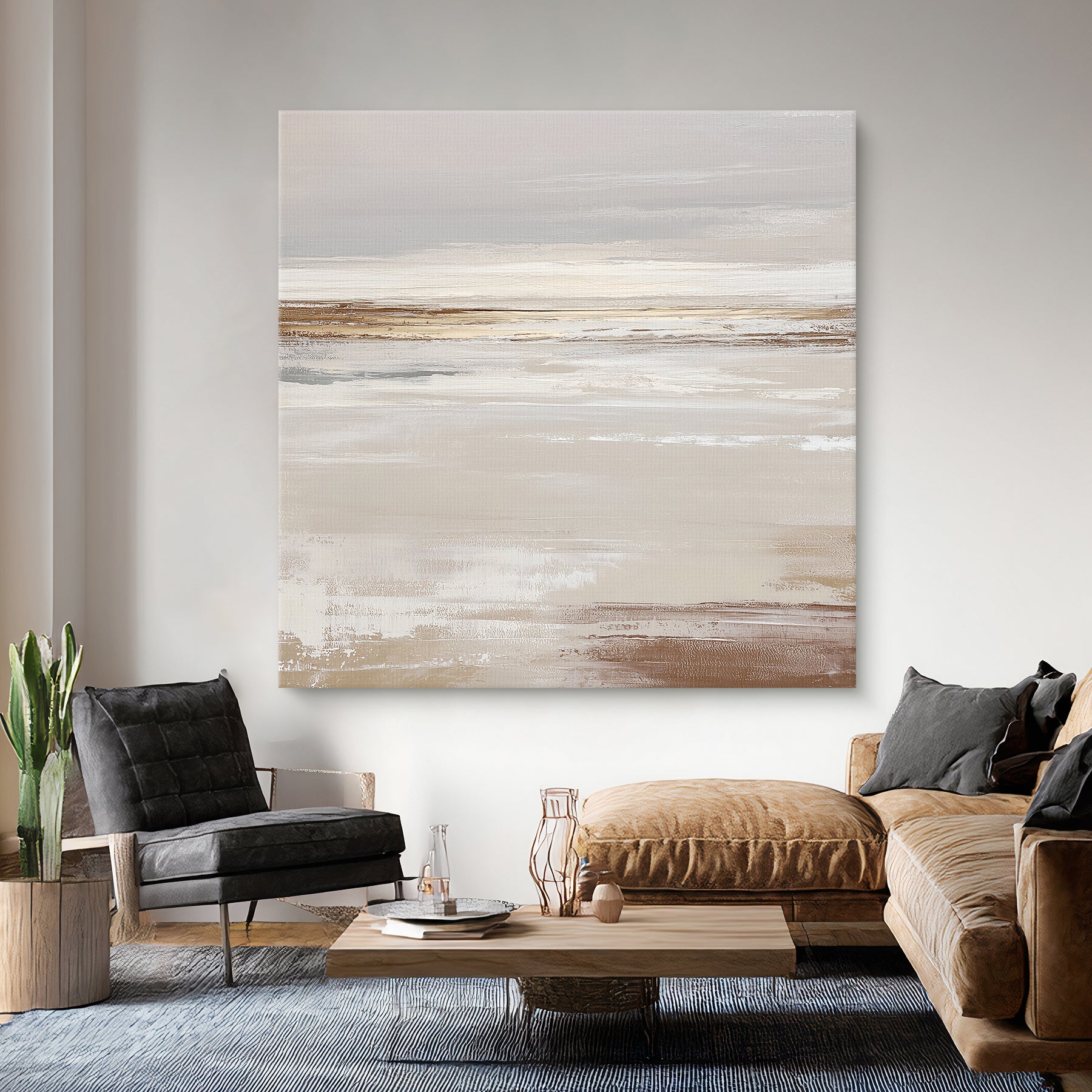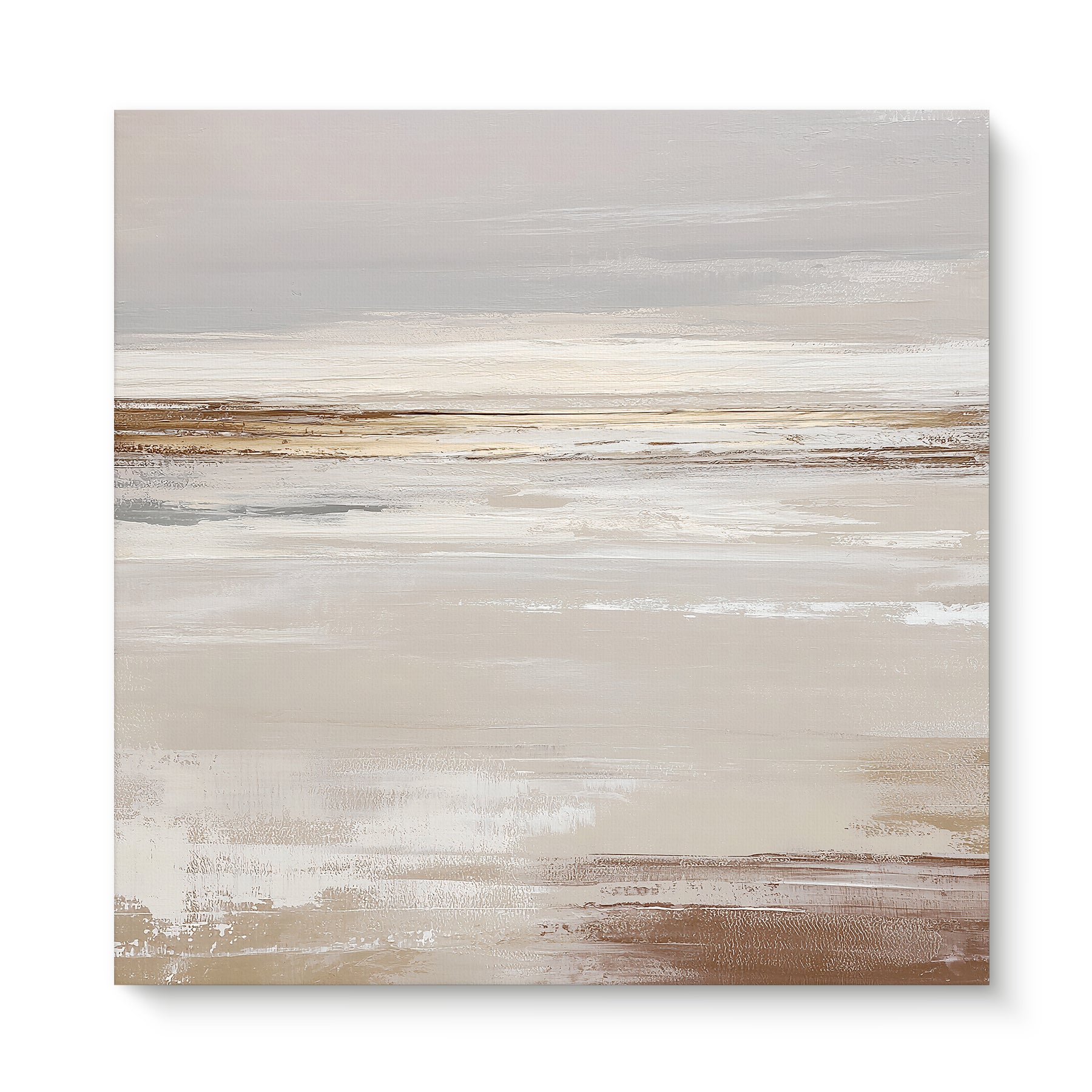 "Desert Calm" is a tranquil abstract artwork that captures the vast, quiet beauty of a warm landscape. The design features a serene palette of earthy beiges, soft whites, and muted browns, with a golden streak that draws the eye across a profound sense of space and a distant horizon. This minimalist piece brings a sense of calm and contemplative depth to any modern interior.