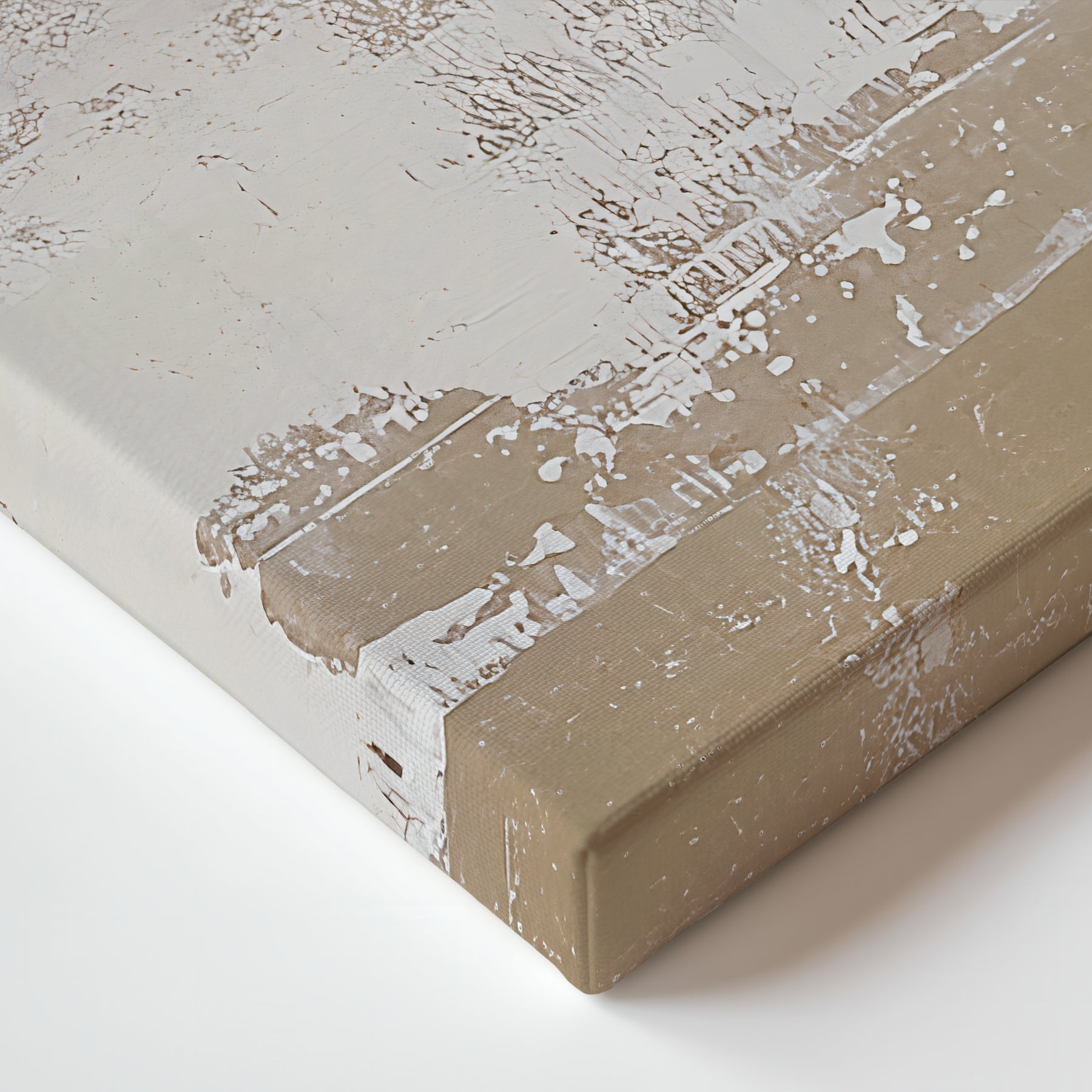 "Desert Calm" is a tranquil abstract artwork that captures the vast, quiet beauty of a warm landscape. The design features a serene palette of earthy beiges, soft whites, and muted browns, with a golden streak that draws the eye across a profound sense of space and a distant horizon. This minimalist piece brings a sense of calm and contemplative depth to any modern interior.