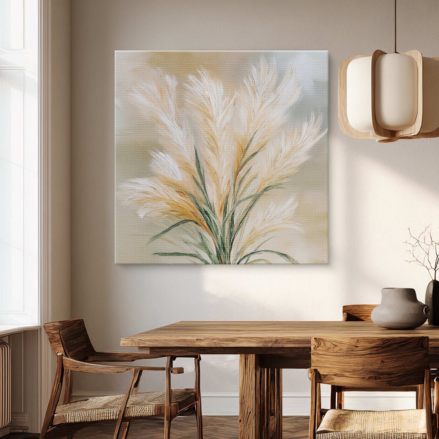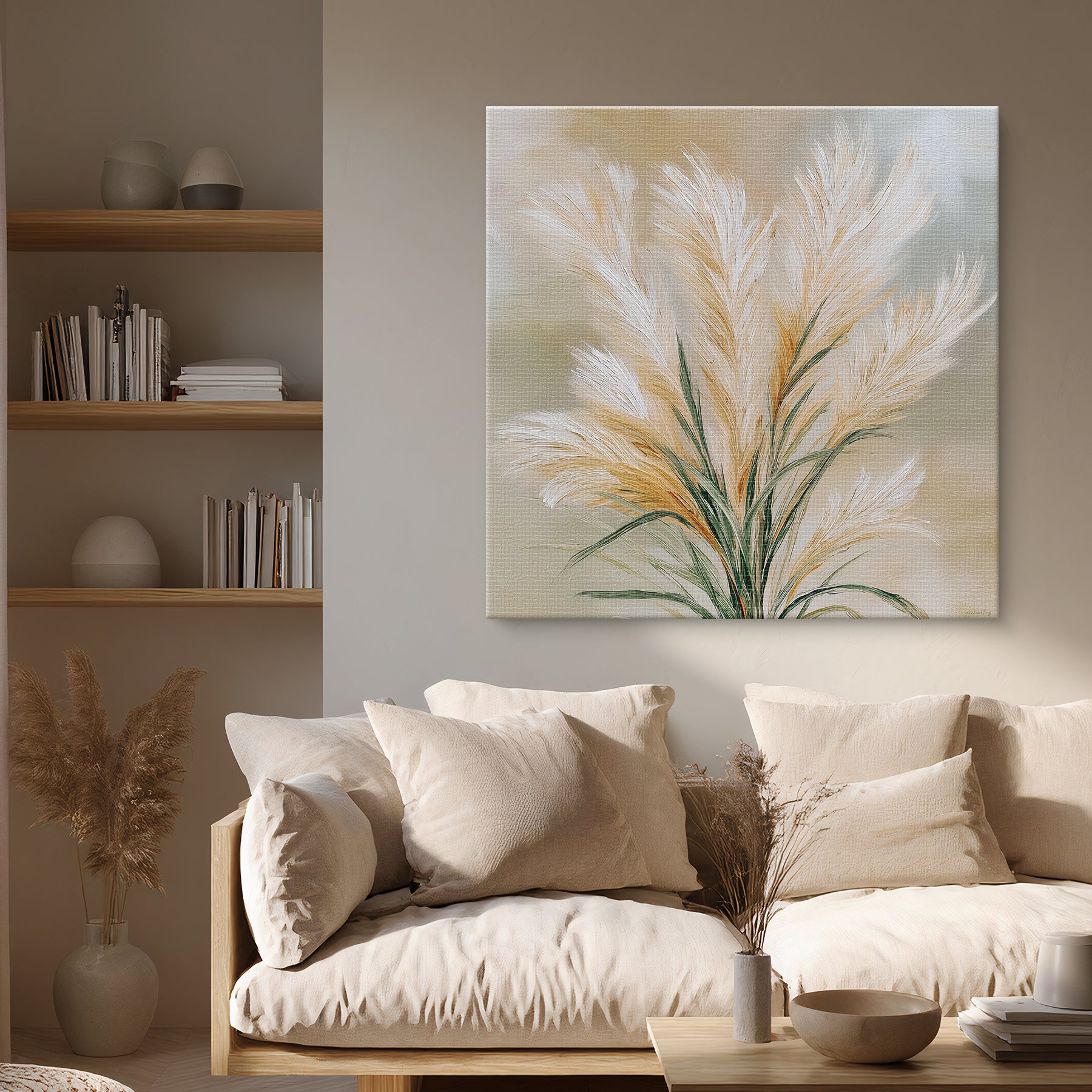 This canvas artwork presents a full pampas grass composition rendered with feather-light texture and natural flow. Warm neutral highlights and soft green stems create a tranquil visual presence that complements modern, Scandinavian, and organic interior styles.