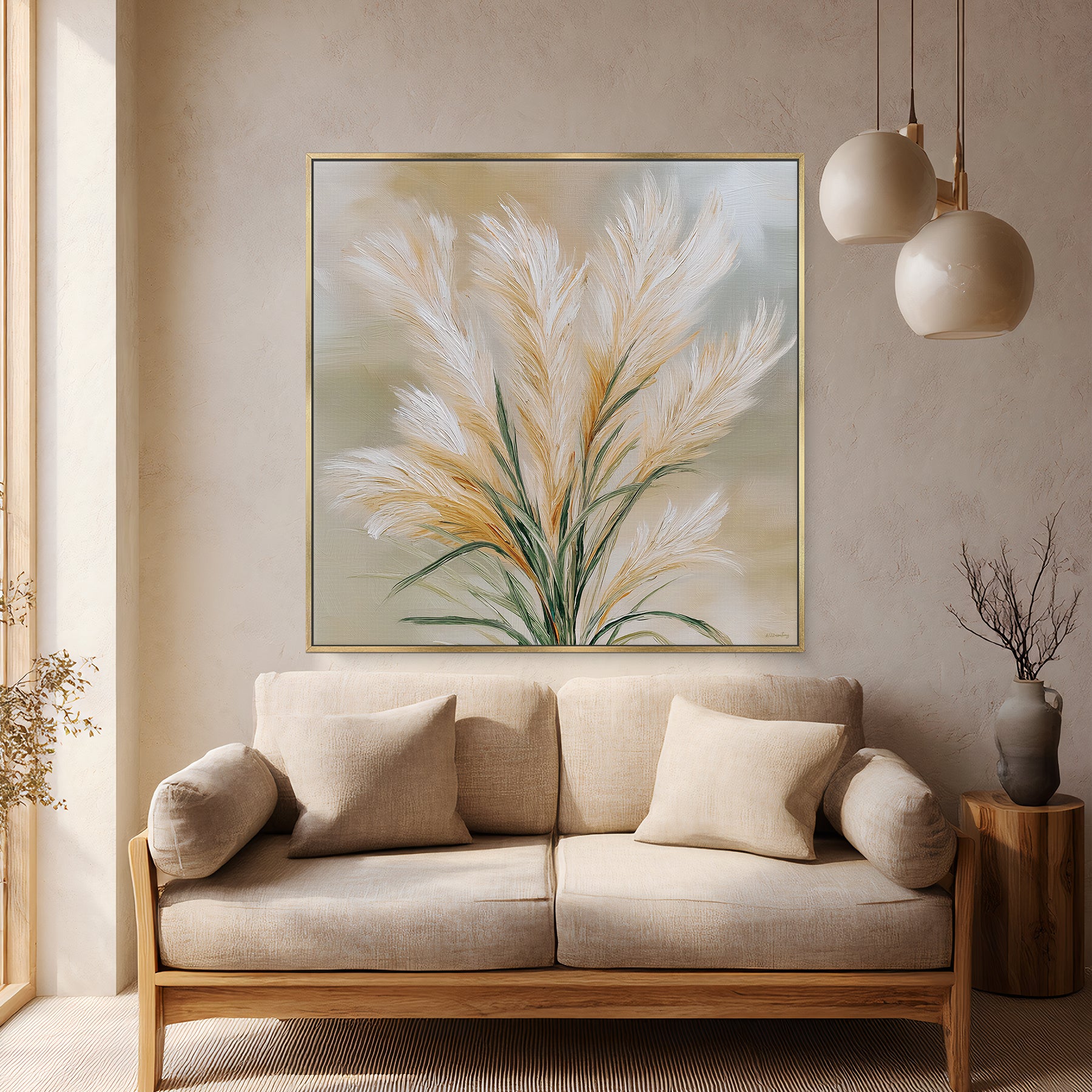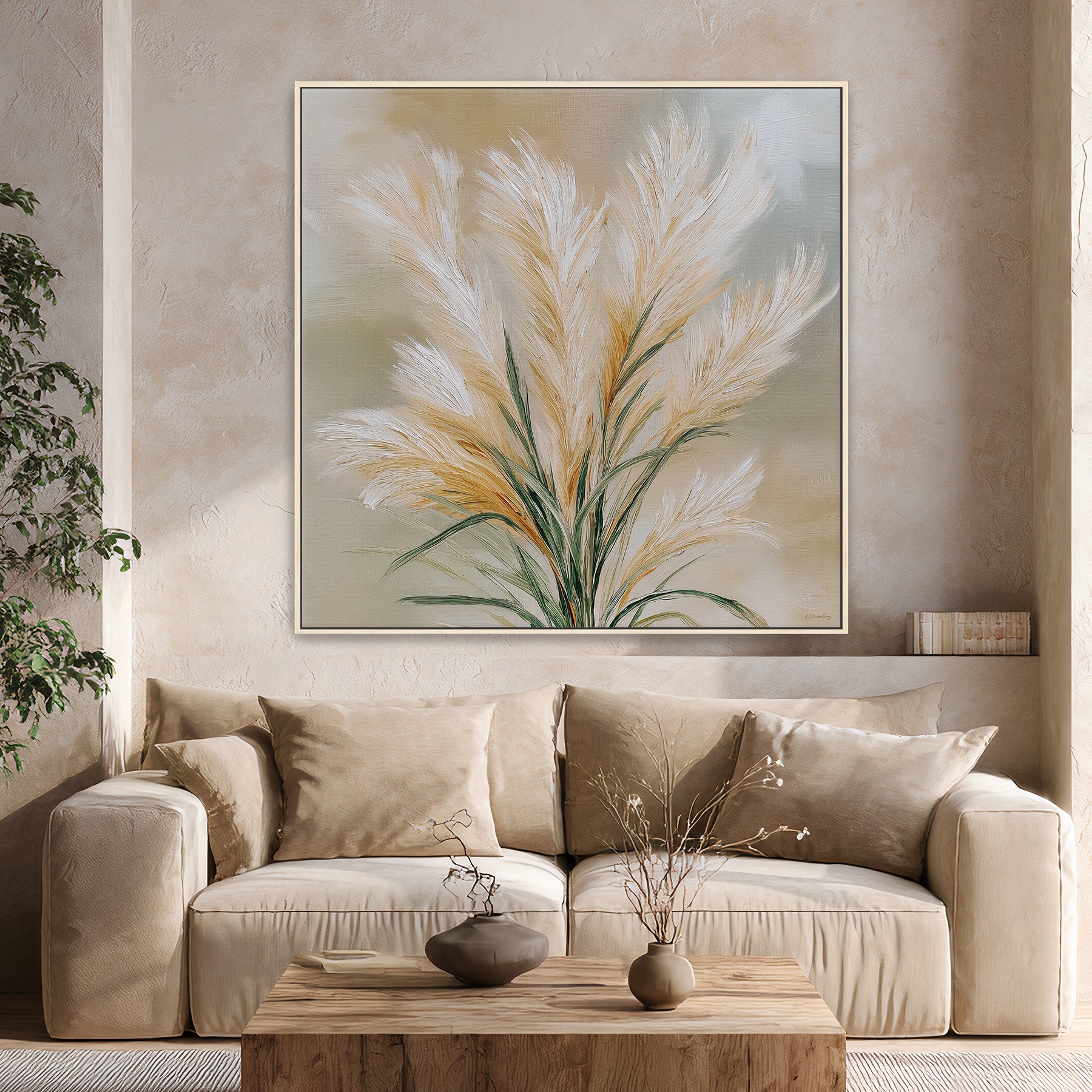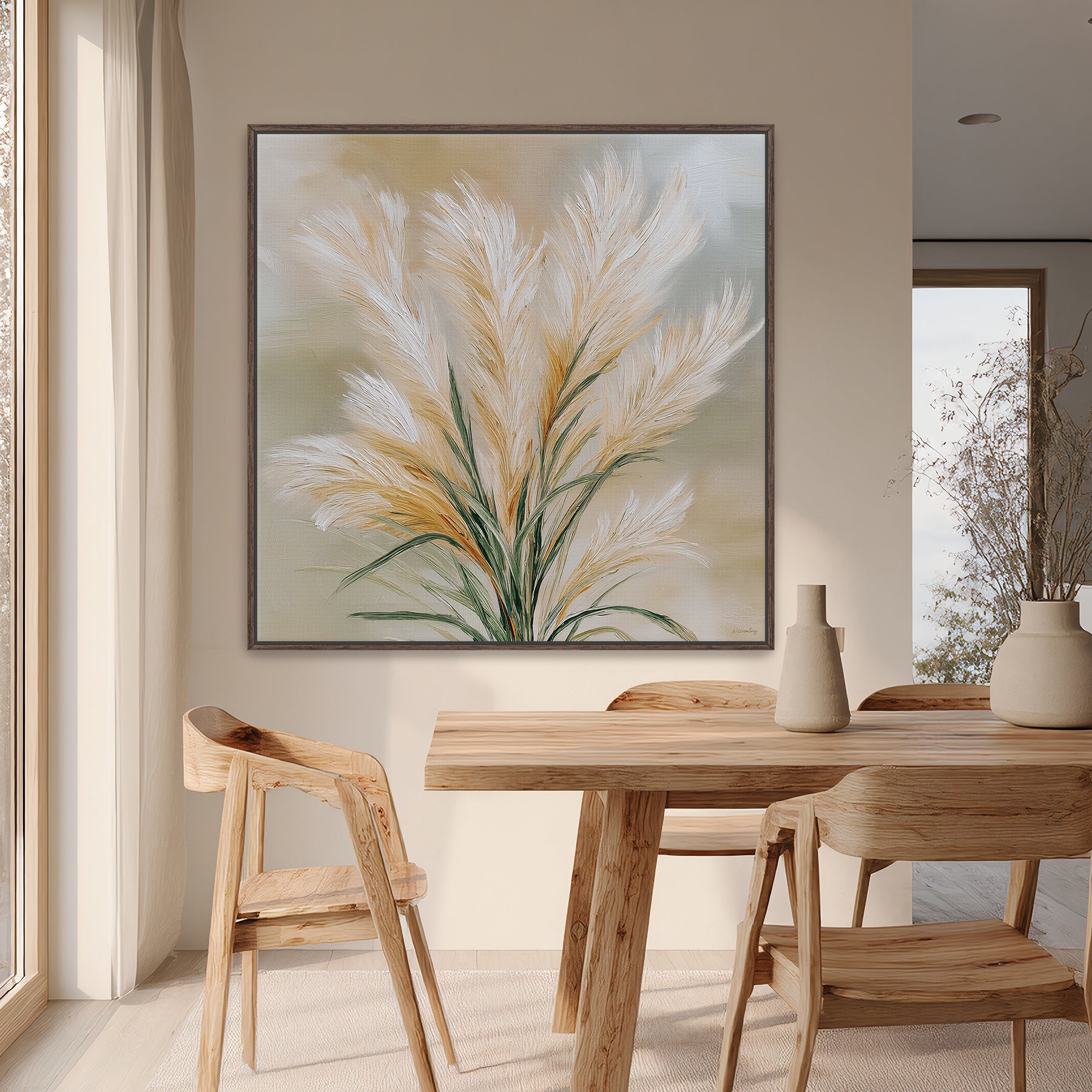 This framed canvas artwork highlights a minimalist pampas grass arrangement painted with soft texture and natural elegance. The full, airy composition and warm palette create a refined focal point that pairs beautifully with contemporary, organic modern, and Scandinavian interiors.