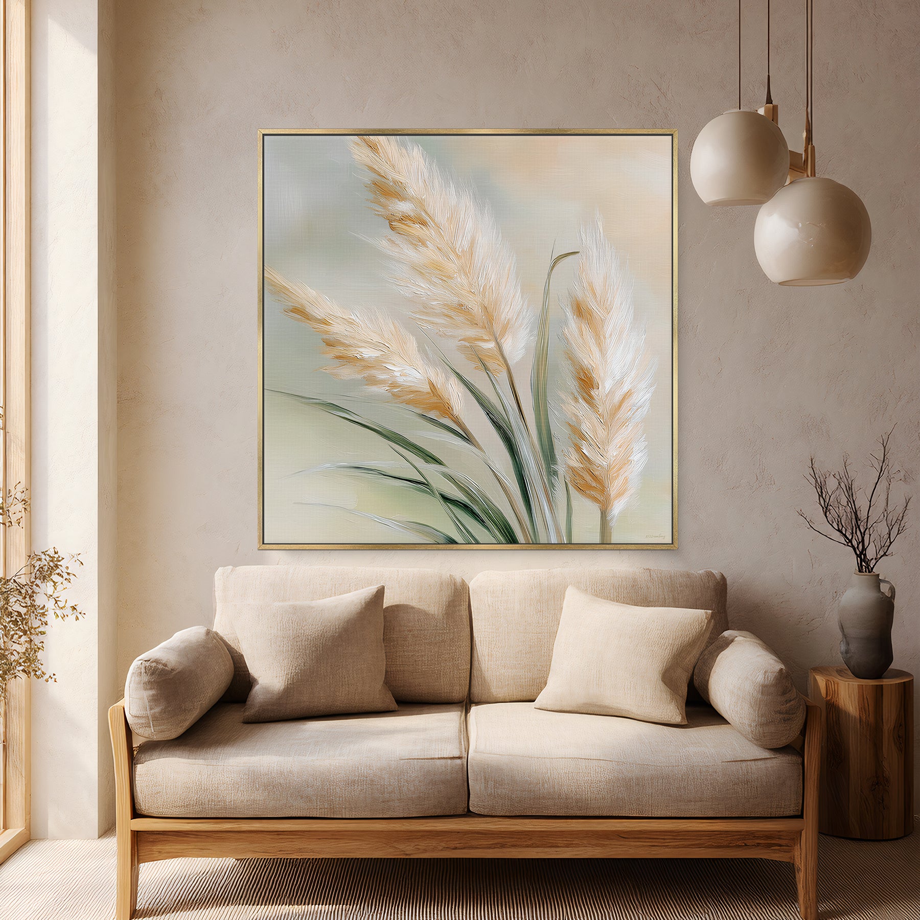 This framed canvas artwork highlights a minimalist pampas grass design painted with soft texture and warm natural tones. The airy composition and gentle highlights create a refined focal point that pairs beautifully with contemporary, organic modern, and Scandinavian interiors.