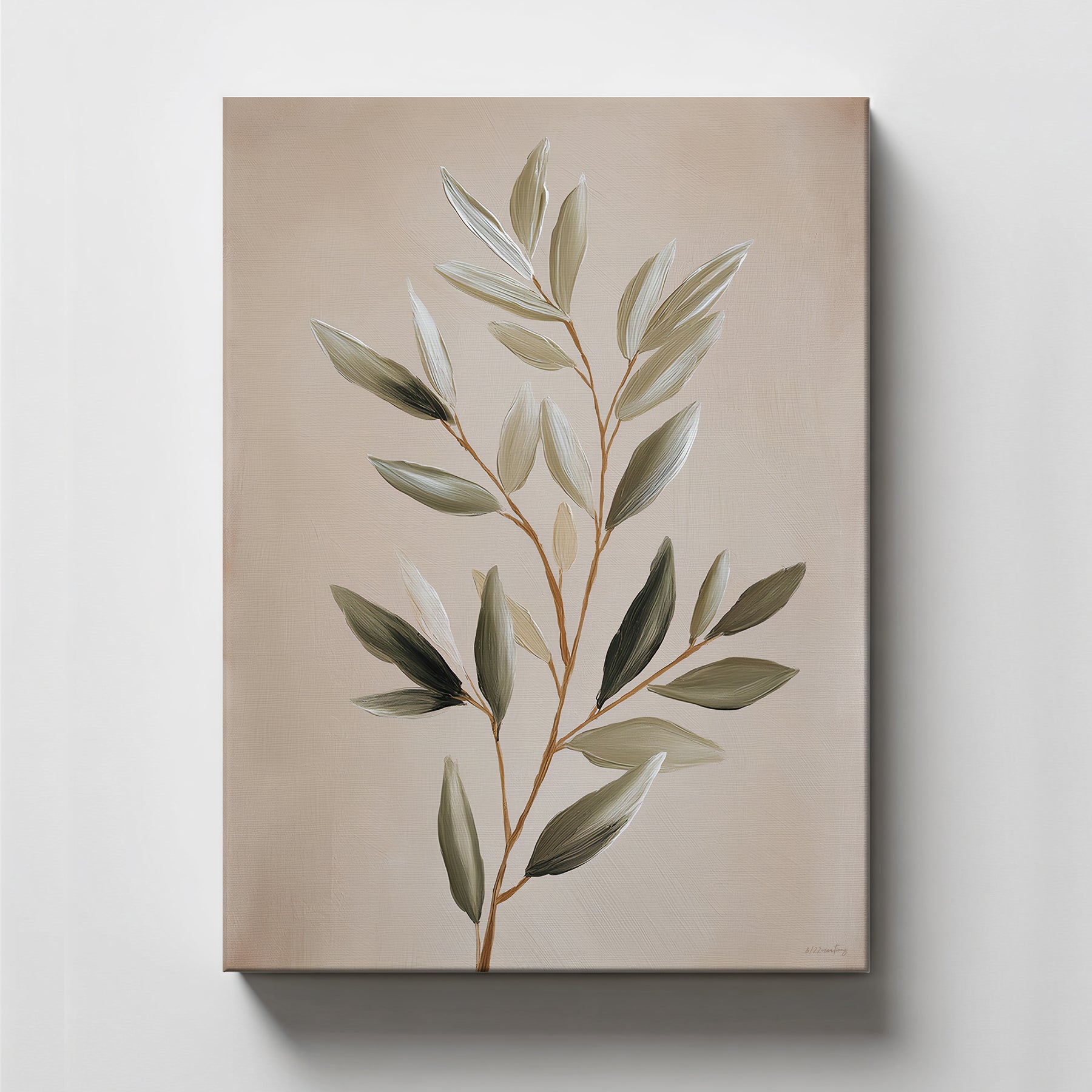 This stretched canvas artwork showcases a serene botanical composition with softly layered olive leaves and a warm, neutral palette. The minimal design and organic flow create a calming focal point that feels both modern and timeless.