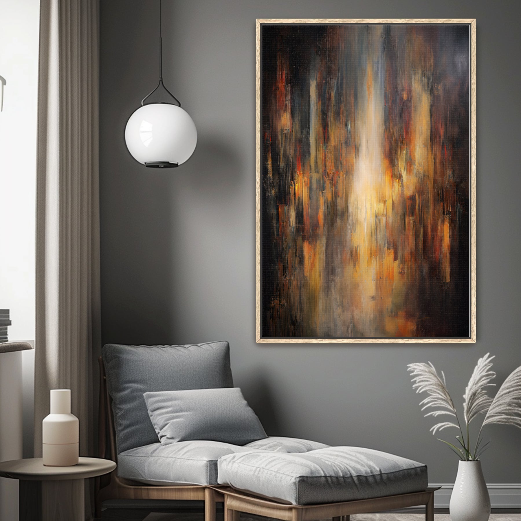 This ready-to-hang giclee print is professionally framed, beautifully showcasing the artwork's luminous texture and vertical flow, suggesting a shower of light. The deep black is highlighted by the luminous central glow of gold, burnt orange, and sienna. The frame provides a refined, finished look, making this piece ideal for creating a powerful and sophisticated atmosphere. It arrives ready to be a centerpiece on your wall.